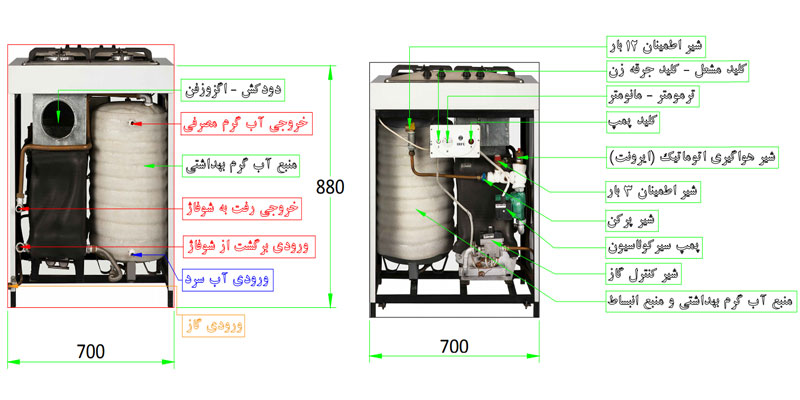 - مجهز به منبع ذخیره آبگرم بهداشتی با ظرفیت ۶۰ لیتری و ۱۲۰ لیتری